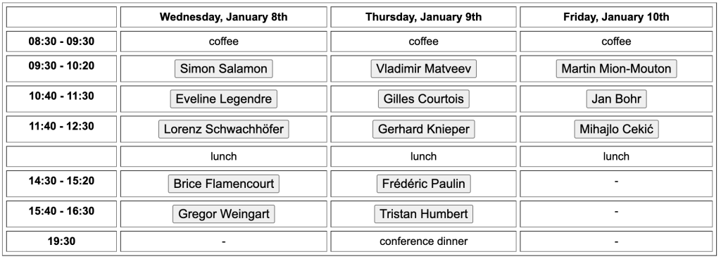 The first day of the workshop (January 8) will focus on geometry, and it will also be a special occasion to celebrate Uwe Semmelmann’s 60th birthday. The rest of the workshop will concentrate on geometric structures arising in dynamical systems, with a particular emphasis on hyperbolic dynamics and negatively curved geometry.